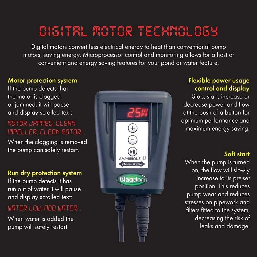 Suitable for waterfalls and filters, the Amphibious IQ combines low maintenance with high performance, and using its digital motor technology consumes around thirty percent less energy that similarly priced pumps.